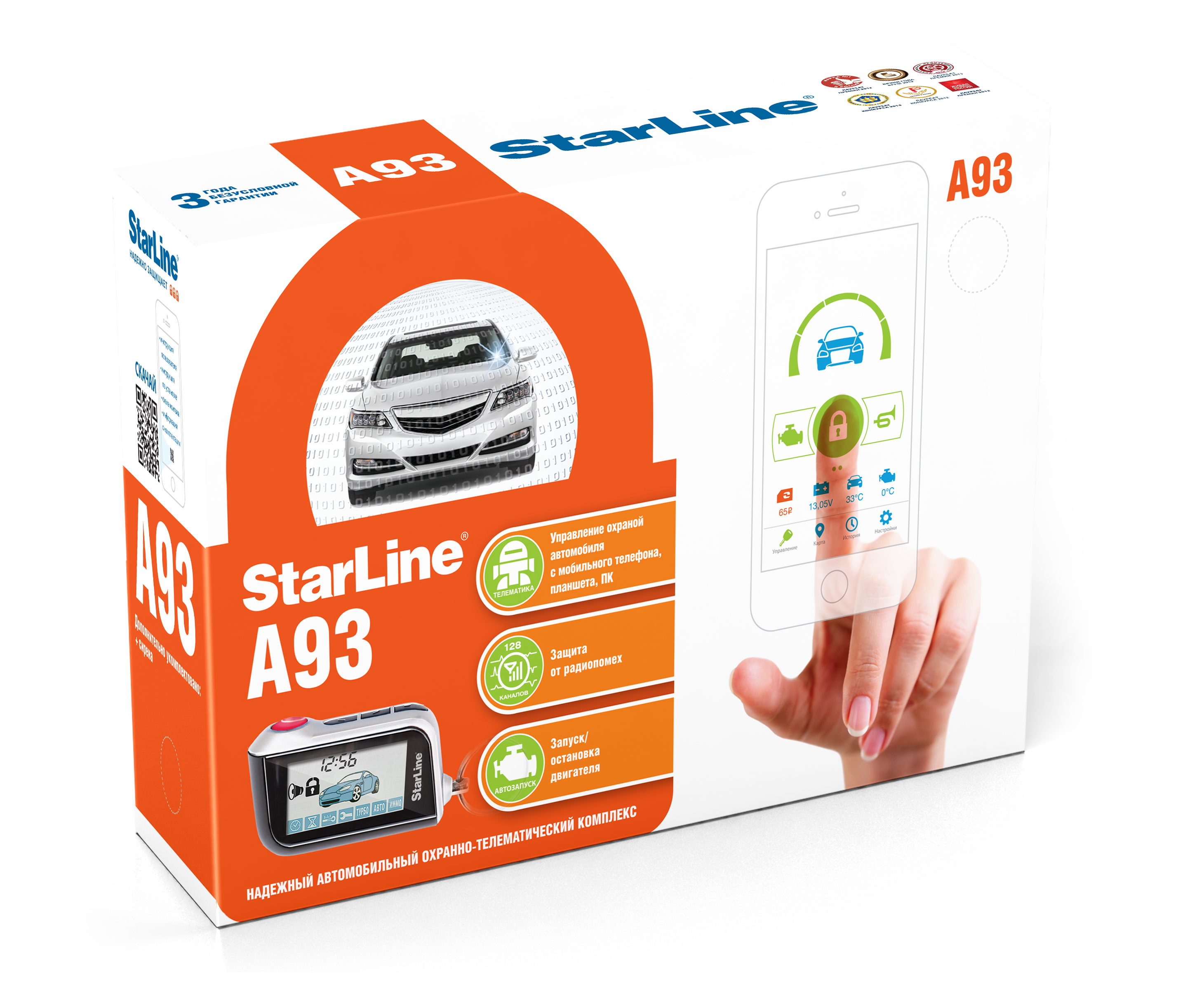 Надежный автомобильный охранно-телематический комплекс с интеллектуальным автозапуском, несканируемым диалоговым кодом управления, опциональными 2CAN+LIN и GSM интерфейсами, опциональным GPS-ГЛОНАСС мониторингом, ударопрочным брелком управления, 128-канальным помехозащищенным трансивером с дальностью оповещения до 2000 м