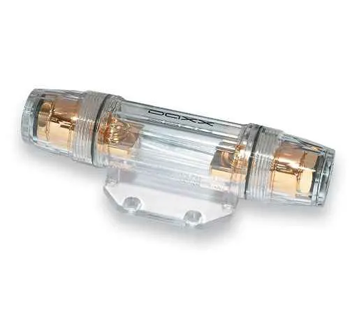 Капсулы (держатели) предохранительные F58 изготовлены из бронзы, позолочены для обеспечения высокой электропроводности, стойкости к коррозии и смонтированы на прочном тугоплавком поликарбонате. Конструкция влагозащищенная. Компрессионные зажимы обеспечивают плотный и надежный контакт и позволяют фиксировать кабели меньшего калибра. Данная капсула имеет компрессионные зажимы для кабелей от 4 до 0/1 калибра и использует предохранители типа ANL. Конструкция F58 запатентована в США. Made in Taiwan